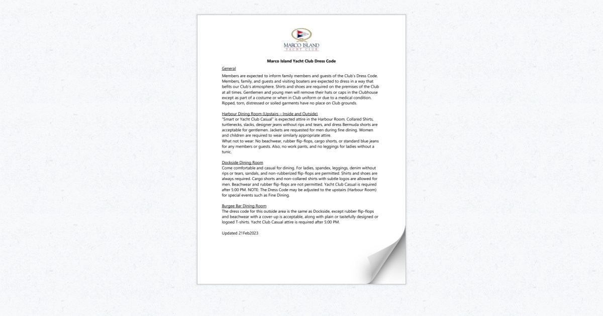 CLICK HERE to contact our Membership Director Katie Fordon. Jolley Bridge entering Marco Island the first thing youll see to your right is Marco Island Yacht Club. All Members and guests are asked to comply with the Clubs dress code as it will enhance the enjoyment of the Club.